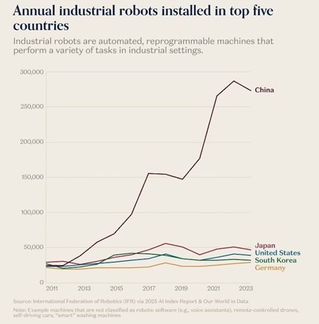 Этот беспрецедентный рост является частью амбициозной государственной программы «Сделано в Китае-2025», запущенной ещё в 2015 году. Её цель — превратить Китай из крупнейшего потребителя роботов в ведущего производителя, и эта цель успешно достигается: уже сейчас почти 60% устанавливаемых в стране роботов производятся на местных предприятиях. Общее число роботов на заводах Китая превысило два миллиона, что больше, чем во всех остальных странах мира вместе взятых.
