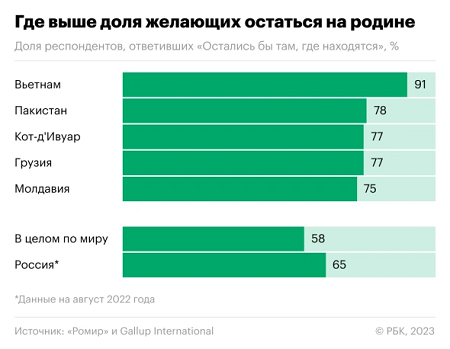 По мере роста благосостояния уменьшается импульс к эмиграции. В странах с доходом выше среднего (к ним относится Россия) и высоким уровнем дохода эмигрировать в среднем хотят 32% жителей. К примеру, во Франции на переезд готовы 30% опрошенных, в США и Германии — 33%, в Великобритании — 36%, в Италии — 37%.