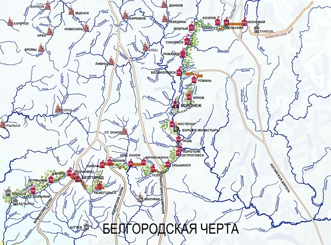 На ней встало 23 города, несколько десятков фортов-острогов, протянулось пять больших земляных валов по 25–30 км каждый. Прошла она от днепровского притока Ворсклы, служившей до 1654 г. русско-польской границей, до р. Челновой, притока Цны. Пересекла территории пяти современных областей: Сумской, Белгородской, Воронежской, Липецкой и Тамбовской, примерно по границе лесостепной и степной зон в направлении с юго-запада на северо-восток.