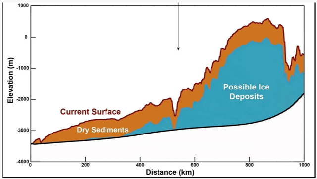 Рельеф и структура подповерхностных слоев в районе, исследованном MARSIS, демонстрируют сухие отложения (потенциально пыль или вулканический пепел) коричневого цвета и предполагаемые залежи, богатые льдом, синего цвета. На графике показана значительная высота ледяных отложений, простирающихся на тысячи метров, и их обширная ширина в сотни километров. Изображение: CReSIS / KU / Смитсоновский институт.