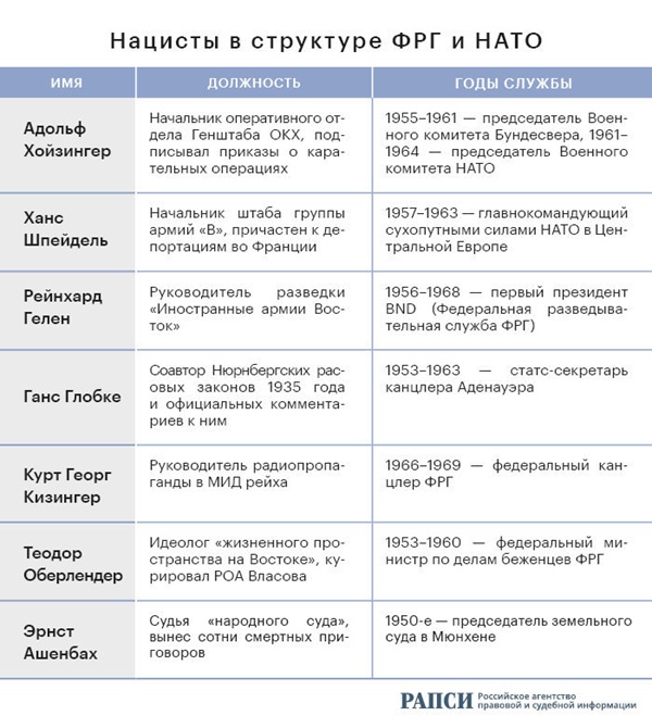 Кадры вермахта и СС составили костяк новой армии ФРГ – бундесвера. 500 бывших офицеров вермахта заняли в нем должности полковников и генералов. Бывший начальник оперативного отдела Генштаба вермахта Адольф Хойзингер, отвечавший за карательные акции на Восточном фронте, стал председателем Военного комитета НАТО.