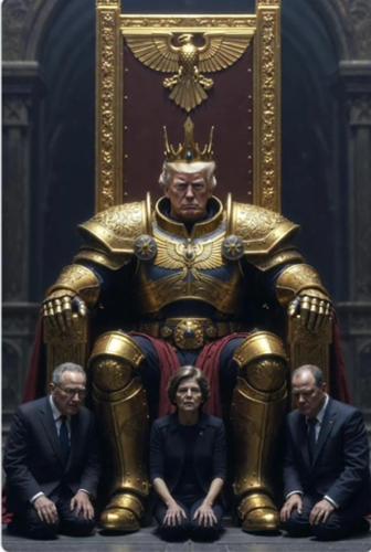 Дональд Трамп «репост­нул» в соци­аль­ной сети Truth Social циф­ро­вое изоб­ра­же­ние, на кото­ром он в цар­ствен­ной позе сидит на троне. «Импе­ра­тор­скую» эсте­ти­ку в духе науч­но-фан­та­сти­че­ской все­лен­ной Warhammer 40000 допол­ня­ют золо­тые доспе­хи и вен­ча­ю­щая трон фигу­ра орла, напо­ми­на­ю­щая бело­го­ло­во­го орла­на — эле­мент Боль­шой печа­ти США.