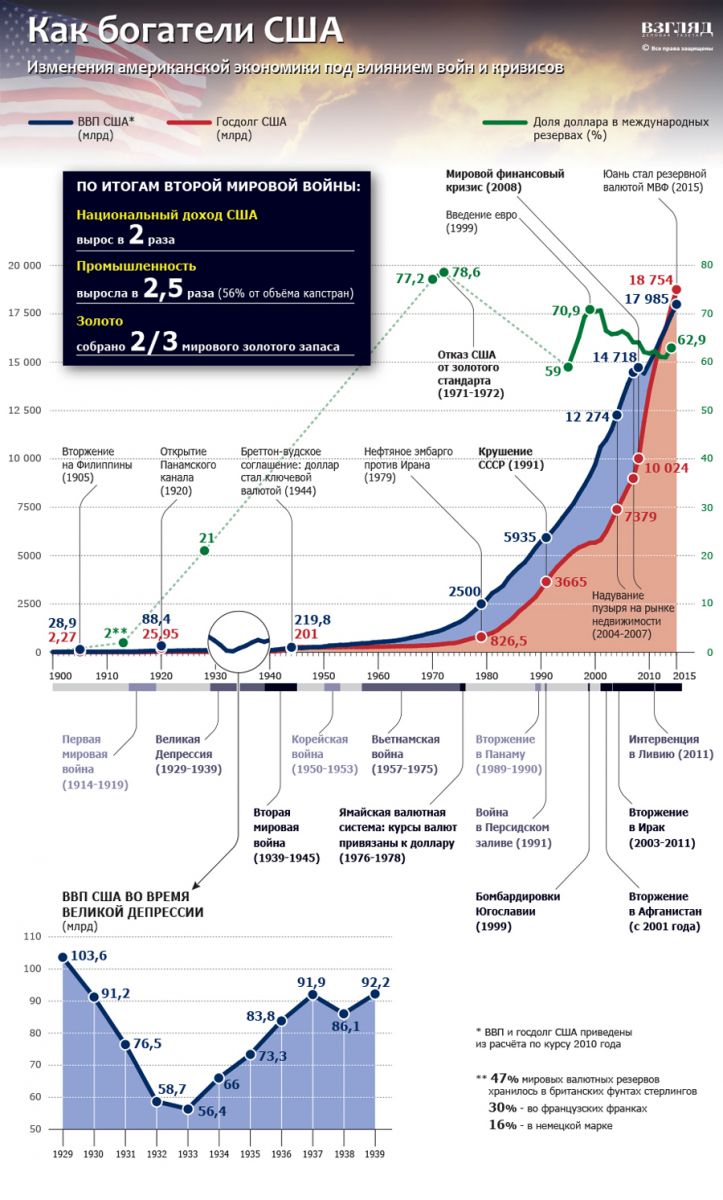 Однако еще до этого золото как бы само стекалось в Америку. Все его владельцы, как правительства европейских стран, так и частные лица, переводили свои сбережения за океан. Если в октябре 1939 года в федеральной резервной системе США хранилось золота на сумму 17 миллиардов долларов, то к февралю 1940-го эта сумма увеличилась на целый миллиард. Миллиард тогдашних денег стоит сейчас 25,7 миллиардов нынешних. Это после того, как Франклин Делано Рузвельт снизил на 40,94%, его золотое содержание. С 31 января 1934 оно было установлено в размере 0,888671 г чистого золота за один доллар. С началом активных боевых действий в Европе приток золота в США еще более увеличился. Только за 10–14 мая в США поступило золота на 46 миллионов долларов. Когда же стало ясно, что Франция вот-вот рухнет, поток золота в США принял громадные масштабы. Только за 3–4 июня в Америку поступило золота на 500 млн. долларов. Но это еще не все. Потом эти средства американцы давали разоренным войной европейцам уже взаймы. Причем на условиях того, что на эти деньги будут покупаться лишь американские товары. Получив, таким образом, обратно эти же деньги, американцы снова давали их в рост своим младшим партнерам. Так, например, 6 декабря 1945 года было подписано англо-американское кредитное соглашение, вступившее в силу 15 июля 1946 года. По договору Англия получала от США 3 миллиарда 750 миллионов долларов. 6-я статья этого договора не позволяла Англии использовать эти деньги на покрытие прежних долгов и не позволяла до 1951 года брать кредиты у других стран.