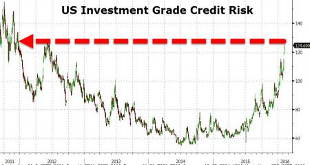 Про чуму долгового рынка США, начавшуюся со сланцевых компаний, и поразившую сегмент мусорных и высокорисковых бумаг, писали неоднократно. А что происходит с более надежными бумагами? Как видно на графике - то же самое, только немного медленнее. Наблюдается рост рисков в разы со второй половины 2015, взята планка 5-летней давности!
