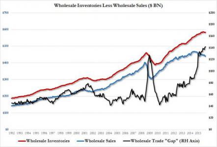 Затоваренность складов в США обновляет рекорды - черная линия на первом графике показывает разрыв между объемами складских запасов у оптовиков и объемами оптовых продаж, обновлен исторический рекорд. Второй график показывает соотношение между ними - как видно, текущий уровень почти достиг уровня рецессии 2001 года!