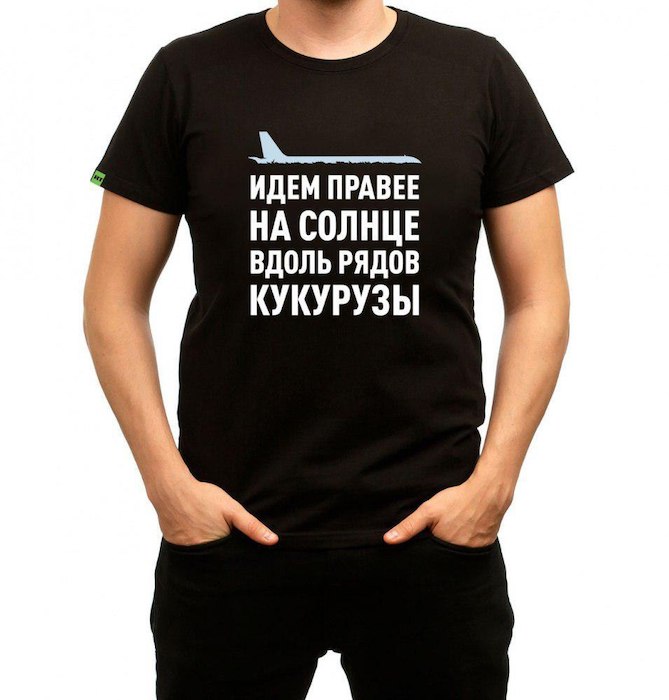 Знаменитая фраза старшего бортпроводника Дмитрия Ивлицкого с рейса А321: «Идем правее на солнце вдоль рядов кукурузы» - стала настоящим хитом. Теперь это фразу народ будет носить на футболках, которые можно купить в онлайн-магазине RT.